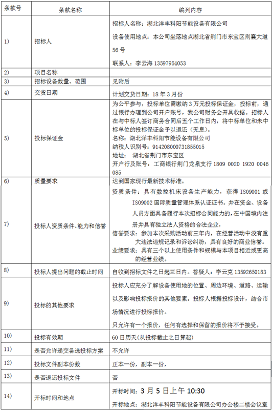 湖北洋豐科陽節能設備有限公司(sī)數控液壓剪板機、數控折彎機招(zhāo)標公告