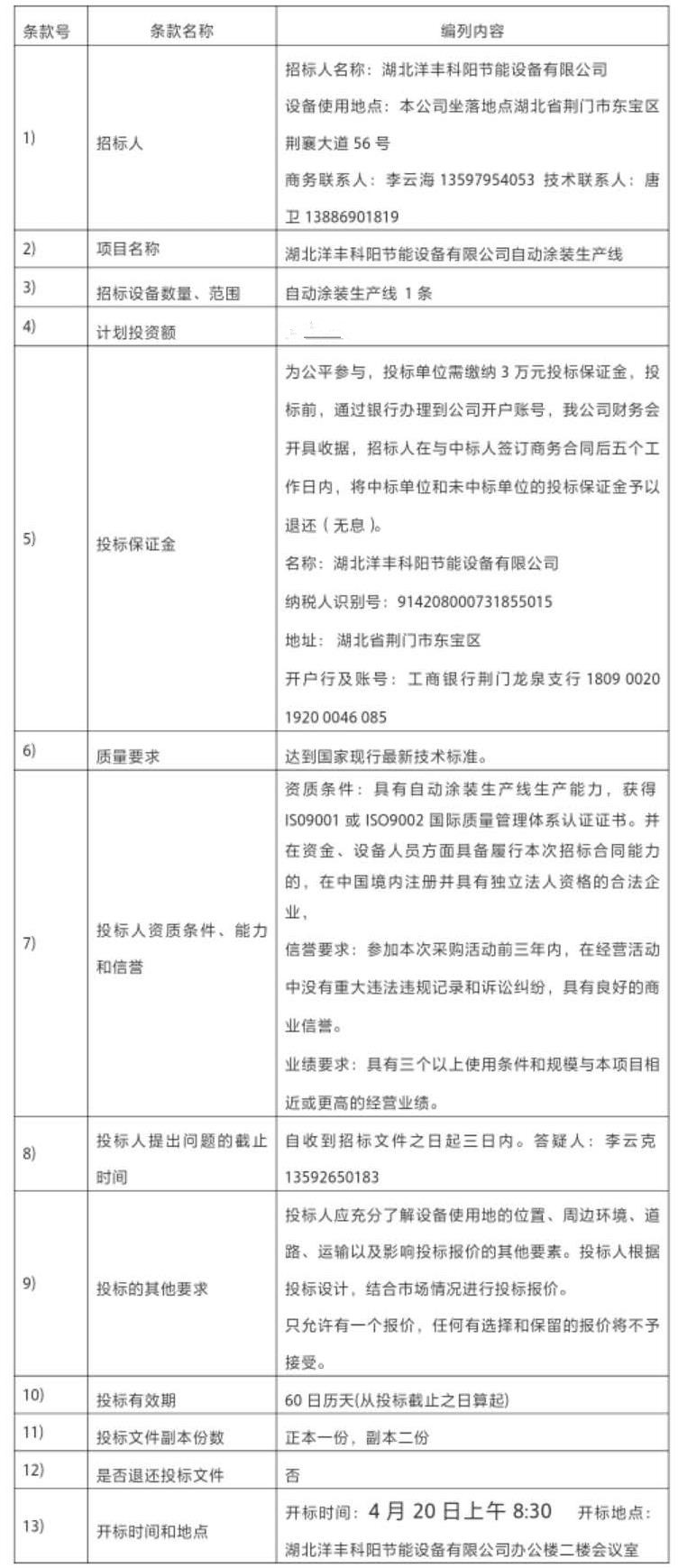 湖北洋豐科陽節能設備有限公司自動塗裝生產線招標(biāo)公(gōng)告