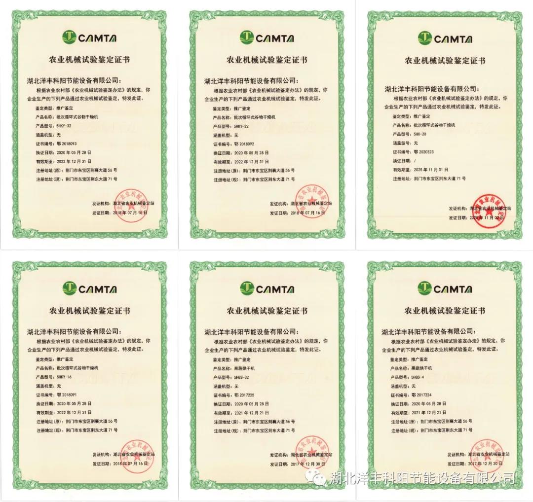近日,湖北省農機鑒定站發布了2020年(nián)第四批《湖北省農業機械推廣鑒定獲證產品及其生產企業目錄》,公司研發生(shēng)產(chǎn)的5HX-20型穀物幹(gàn)燥機產(chǎn)品名列其中,並獲得了由湖(hú)北省農機鑒定站頒(bān)發的《農業(yè)機械試驗鑒定證書》。